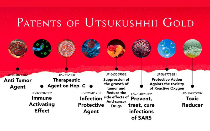 Terbuat dari bahan-bahan alami. 8 Bahan utamanya antara lain : Salmon DNA, Takara Combu Fucoidan, Triple Probiotik, Bawang Hitam, Extrak Nanas, Ekstrak Kulit Anggur, Ektrak Biji Kiwi, Vitamin D dan lain lain. Utsukushhii Gold memiliki 8 paten manfaat seperti yang tertera di bawah ini :