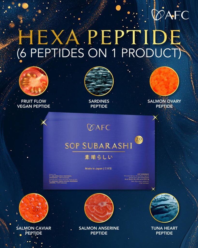 SOP Subarashi Gold merupakan produk 6 peptide di Jepang yang memiliki bahan utama yaitu Marine Placenta ikan Onchorhynchus Keta Salmon di Hokkaido, Sardine Peptide, Salmon Caviar Peptide, Salmon Anserine Peptide, Tuna Heart Peptide dan Fruitflow (vegan peptide).